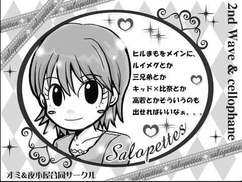 ていうかところどころの御日記で見かける『サロペッツ』の文字。あわわー。何か結構サークル名で呼ばれたりするんだ・・・すごい適当な名前でごめんなさい・・・!真剣に考えた形跡がまるでみられない名前で本当ごめんなさいと、パソ前で一人反省。二人揃ったらきっと馬鹿笑い。
